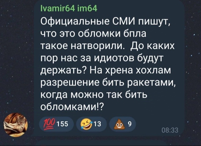 > Не очень похоже на то, что написано в интернете про паляницу, может и какой другой украинский реактивный дрон сбили, а может и собственный шахед-238
