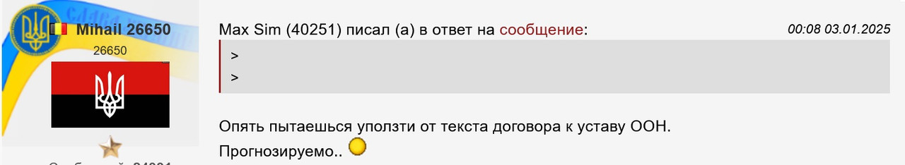 >> >> Опять пытаешься уползти от текста договора к уставу ООН. >> Прогнозируемо.