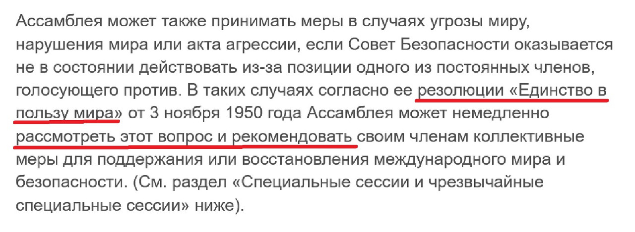 дурака не получится включить ... нет никакой моей правоты- есть устав ООН где прописано черным по белому Резолюция ГА ООН «Единство в пользу мира» это лишь рекомендация