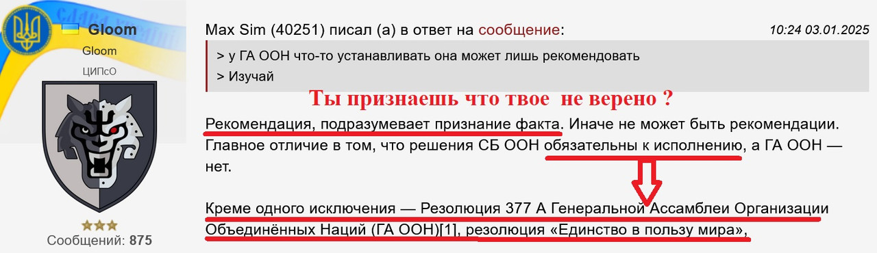> > Ну ты реально уже тупишь. > Я тебе и документ на основании которого действует ГА ООН в особых случаях назвал и прецеденты перечислил и скрин кинул, по конкретному эпизоду, где ГА ООН требует и настоятельно рекомендуют, а ты все свое толдычишь.