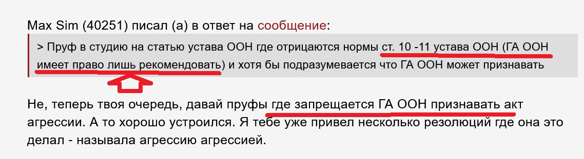 Ты же не сольешь и предоставишь пруф из устава ООН на твою чушь «ГА ООН может признать акт агрессии или другого нарушения,» или все же сольешся?