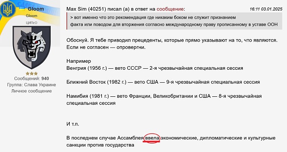 > Поздно метаться … пытаясь уползти на неправильно выразился ….не прокатит… Ты же не просто так единожды ляпнул, а доказывал сначала что > — ГА ООН ввела санкции > А как понял что ложанулся решил уползти > — На основании резолюции ГА ООН, СБ ООН ввели санкции > Но и тут у тебя не получилось уползти от факта что ложанлся и ты начал писать