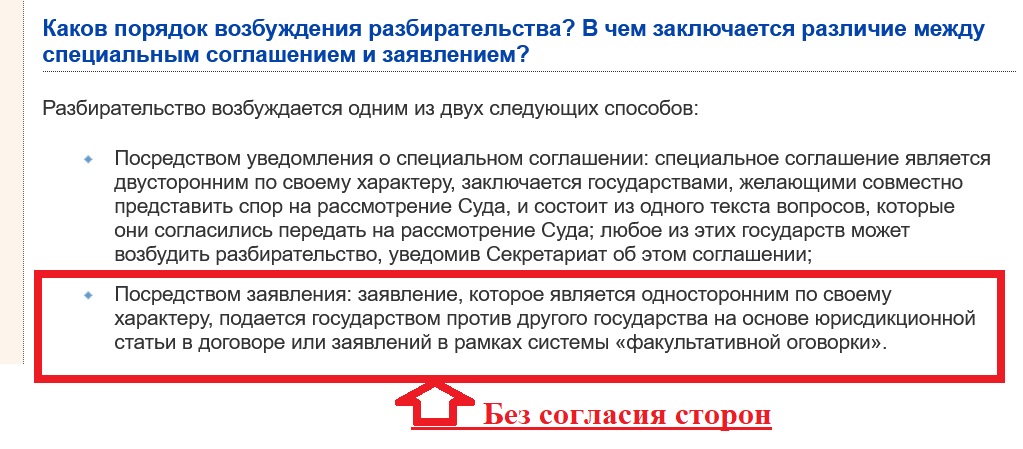 >Так ведь прямо написано - МС может рассматривать дело лишь в том случае , если соответствующие государства определенным образом дали согласие на то, чтобы стать стороной разбирательства в Суде >