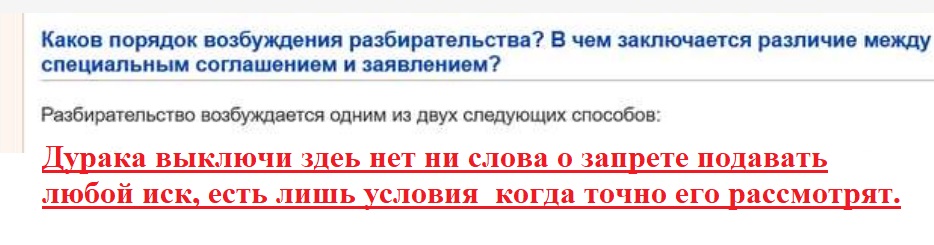 >>>>> от факта что вас жестко болванять, рассказывая почему не подаете иск, тебе не уползти …. прежде чем решать о возможности рассматривать дело нужно чтоб вы подали иск >>>> Да только с согласия двух сторон в Суд можно обратиться. Ну прямо же в документе сказано. >>> Все очень просто решается Пруф в студию где ты вычитал свою чушь