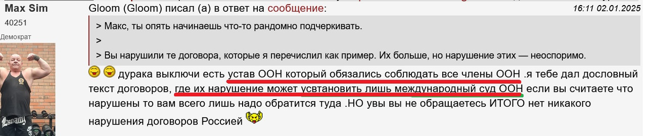 > С какого перепугу? Где ты это вычитал? Твои трактовки устава ООН нам мало интересны. > К тому же ещё не все страны являются членами ООН. > И так заканчивай свою болтовню. И конкретно укажи где написано, что все страны должны решать свои споры исключительно в суде ООН?