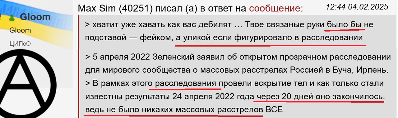 >>>> забавно как вы хаваете на ура как вас дебилят голословными заявами ….вы ведь до сих пор верите в бучу и вам похрен что страны НАТО, что так яро требовали расследования, теперь помалкивают в тряпочку о том что украина закрыла расследование, ведь не было никаких расстрелов, а погибли от осколочных ранений кассетных снарядов