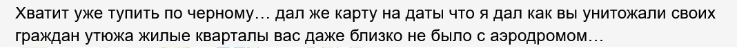 Поясни что значит твое «гатили»? Хватит уже тупить по черному… дал же карту на даты что я дал как вы унитожали своих граждан утюжа жилые кварталы вас даже близко не было с аэродромом…