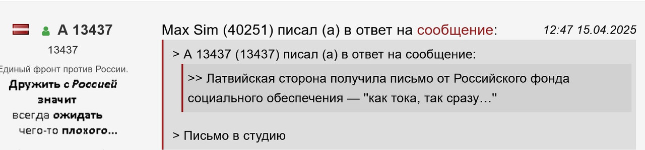 >> Латвийская сторона получила письмо от Российского фонда социального обеспечения — ''как тока, так сразу…''