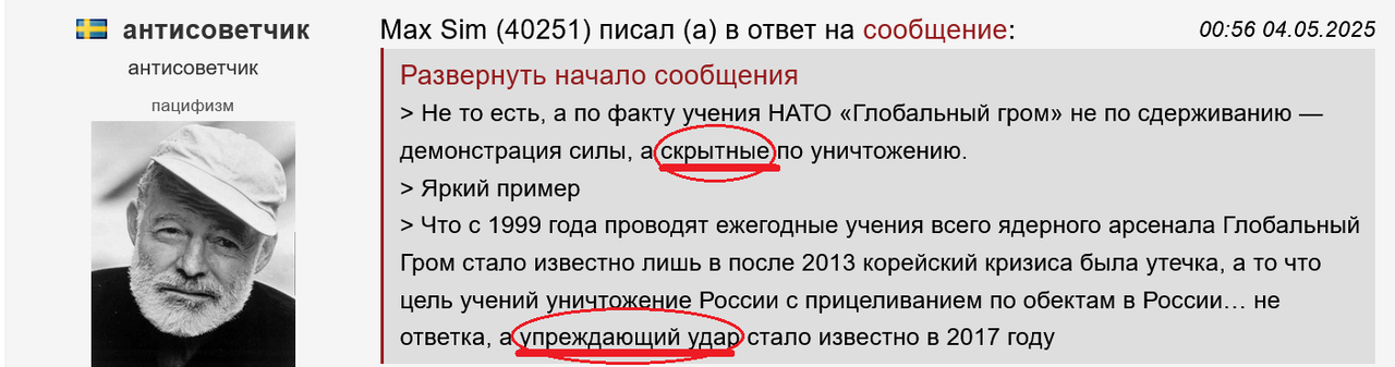 >> Не то есть, а по факту учения НАТО «Глобальный гром» не по сдерживанию — демонстрация силы, а скрытные по уничтожению.