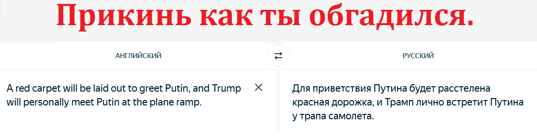Прикинь как ты опять обтрухался ..после вступления трампа на должность ОН еще никого не встречал у самолета и никому не стелили дорожку ....а ведь к нему прилетали лидеры ЕС