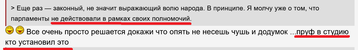 > > Еще раз — законный, не значит выражающий волю народа. В принципе. Я молчу уже о том, что парламенты не действовали в рамках своих полномочий.