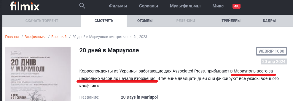 >> Хрен у тебя получится уползти… обсуждаем конкретно фильм «20 дней мариуполе» Да в битве за Мариуполь вы расстреливали обьекты за линией соприкосновения у себя в тылу где не было наших, но были ваши гражданские >>