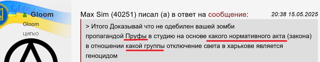 > Итого Доказывай что не одебилен вашей зомби пропагандой Пруфы в студию на основе какого нормативного акта (закона) в отношении какой группы отключение света в харькове является геноцидом