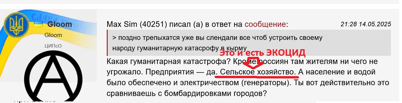 Чувак, мы говорили о преступлении, которое вы совершаете и к совершению которому призывал Луговой. А ты что про неурожой рассказываешь, называя экоцидом. Картохи меньше выростет. Которую почему то, Украина обязана поливать Ну реально сумасшедшие.