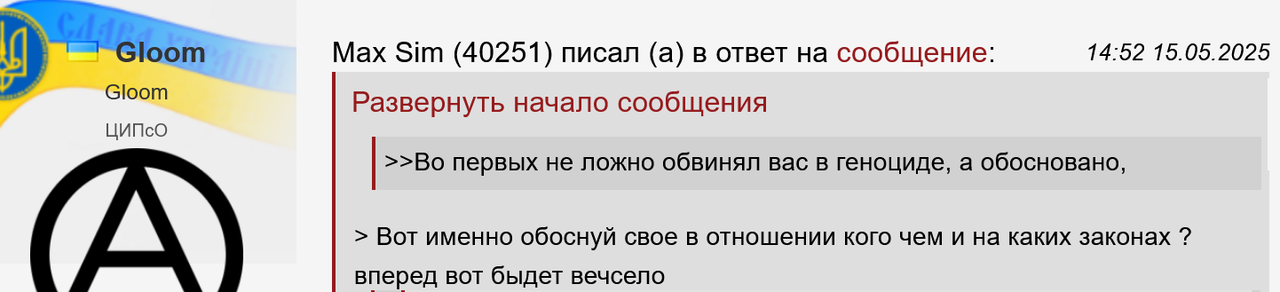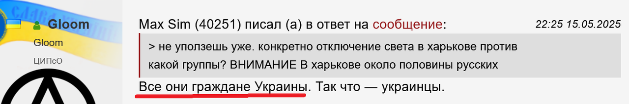 > Max Sim (40251) писал (а) в ответ на сообщение: > Я не про Харьков, а про вашу войну в целом. Призывы уничтожить Харьков и другие города, изгнать от туда население — это лишь часть целой картины.
