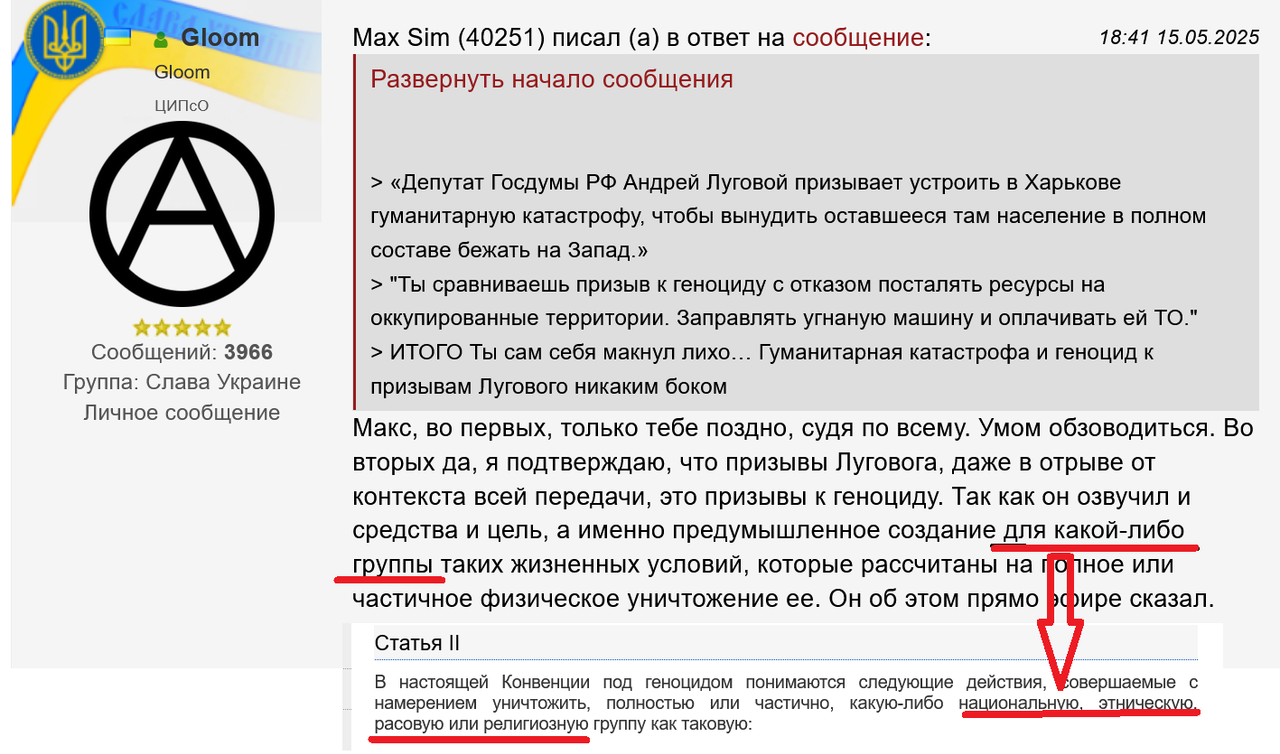 Макс, во первых, только тебе поздно, судя по всему. Умом обзоводиться. Во вторых да, я подтверждаю, что призывы Луговога, даже в отрыве от контекста всей передачи, это призывы к геноциду. Так как он озвучил и средства и цель, а именно предумышленное создание для какой-либо группы таких жизненных условий, которые рассчитаны на полное или частичное физическое уничтожение ее. Он об этом прямо эфире сказал.