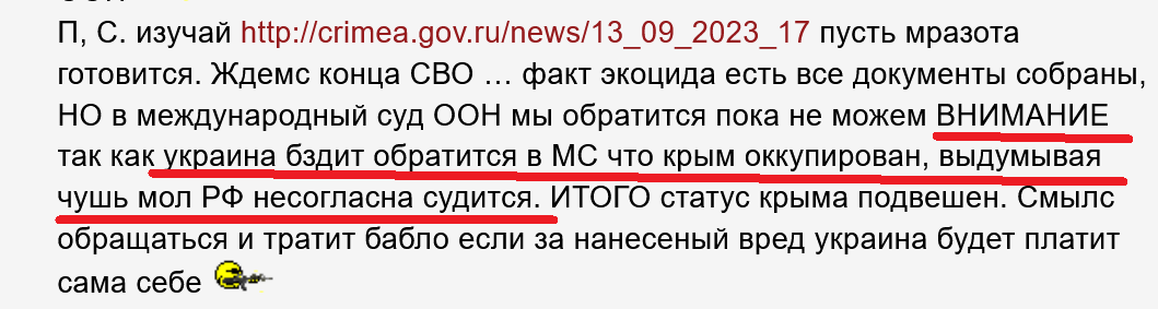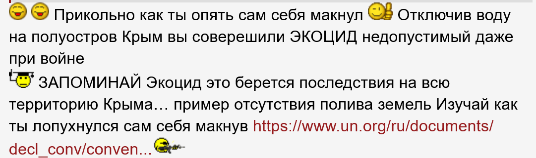 > Учи конвенцию ссылку дал Экоцид делопустим даже при войне и берутся последствия отключение вами воды на всю территорию Крыма > ваши мрази конченные и ты сам это признал >
