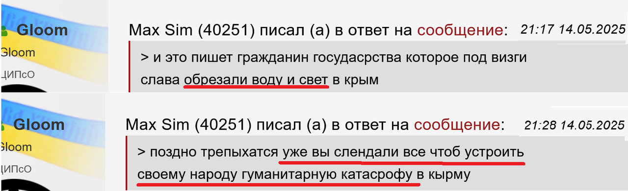 Ты глупым прикидываешься? Я ж тебе уже несколько раз сказал — ни как жизни населению Крыма не угрожало отключение воды и электричества. В Крыму есть своя вода. И было свое электричество. Если ты этого не знал — значит ты оболваненный и попался на российскую пропаганду разжигание ненависти и войны.