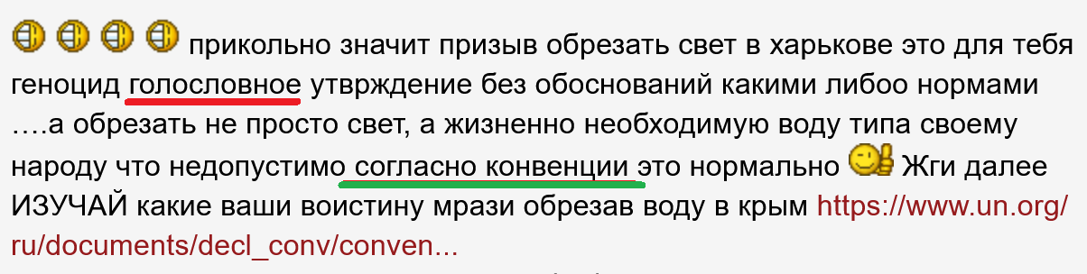 забывненко вас там дебилят Вы учи что такое цивиллизованность …… Подсказка Начало СВО нами обосновно уставом ООН П, С. изучай пусть мразота готовится. Ждемс конца СВО … факт экоцида есть все документы собраны, НО в международный суд ООН мы обратится пока не можем ВНИМАНИЕ так как украина бздит обратится в МС что крым оккупирован, выдумывая чушь мол РФ несогласна судится. ИТОГО статус крыма подвешен. Смылс обращаться и тратит бабло если за нанесеный вред украина будет платит сама себе