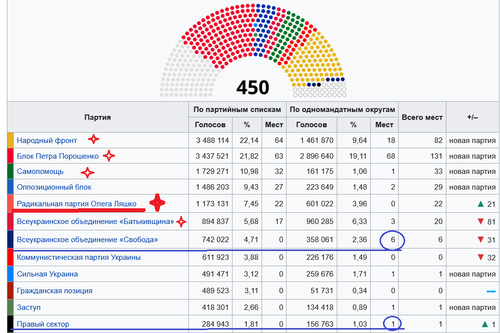 >> Брехня однако. На внеочередных выборах в 2014 году. В Раду не прошли не «СВОБОДА» ни «Правый сектор». А «Оппозиционный блок» набрал аж 10% голосов.