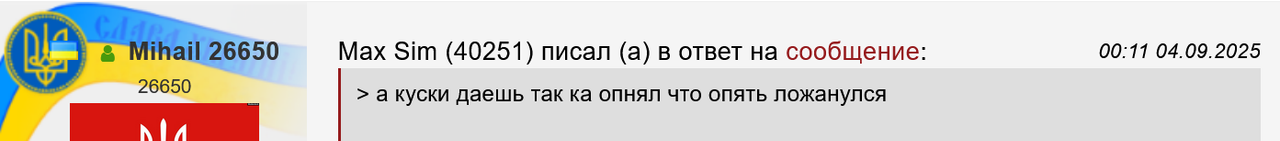 >>> >>> Mihail 26650 (26650) писал (а) в ответ на сообщение: >>>> Max Sim (40251) писал (а) в ответ на сообщение: >>>>> а куски даешь так ка опнял что опять ложанулся >>>> >>>