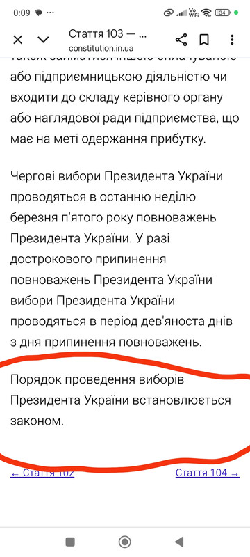Статья 103. Президент Украины избирается гражданами Украины на основе всеобщего, равного и прямого избирательного права путем тайного голосования сроком на пять лет. Президентом Украины может быть избран гражданин Украины, достигший тридцати пяти лет, имеющий право голоса, проживающий в Украине в течение десяти последних перед днем выборов лет и владеющий государственным языком. Одно и то же лицо не может быть Президентом Украины более двух сроков подряд. Президент Украины не может иметь иной представительский мандат, занимать должность в органах государственной власти или в объединениях граждан, а также заниматься иной оплачиваемой либо предпринимательской деятельностью или входить в состав руководящего органа или наблюдательного совета предприятия, что имеет целью получение прибыли. Очередные выборы Президента Украины проводятся в последнее воскресенье марта пятого года полномочий Президента Украины. В случае досрочного прекращения полномочий Президента Украины выборы Президента Украины проводятся в период девяноста дней со дня прекращения полномочий. Порядок проведения выборов Президента Украины устанавливается законом.