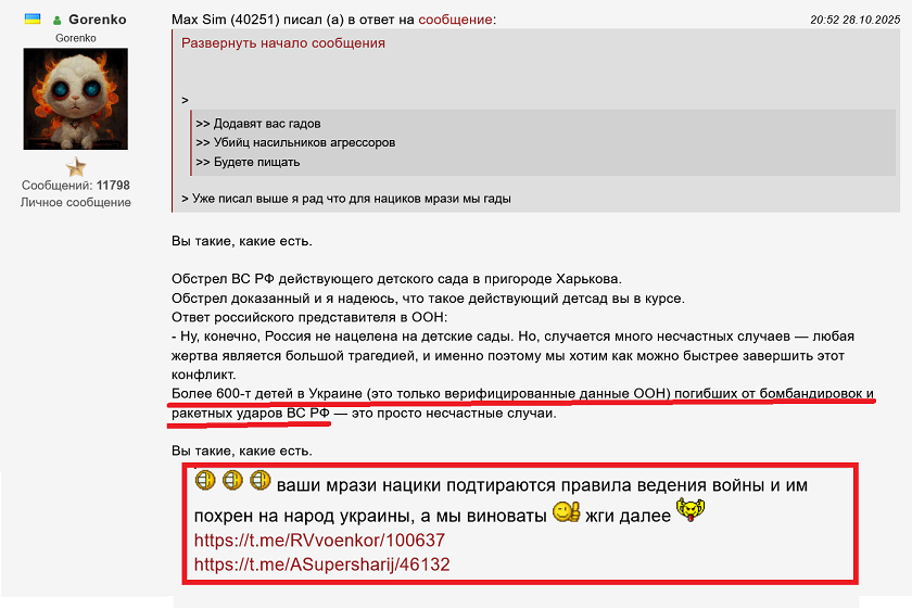 >>>> Более 600-т детей в Украине (это только верифицированные данные ООН) погибших от бомбандировок и ракетных ударов ВС РФ — это просто несчастные случаи. >>>> Вы такие, какие есть. >>> ваши мрази нацики подтираются правила ведения войны и им похрен на народ украины, а мы виноваты жги далее