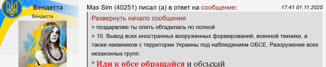 > поздарвляю ты опять обгадилась по полной > 10. Вывод всех иностранных вооруженных формирований, военной техники, а также наемников с территории Украины под наблюдением ОБСЕ. Разоружение всех незаконных групп. > Иди к обсе обращайся и обсыхай