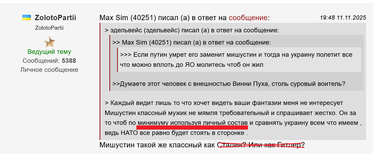 Каждый видит лишь то что хочет видеть ваши фантазии меня не интересует Мишустин классный мужик не мямля требовательный и спрашивает жестко. Он за то чтоб по минимуму используя личный состав и сравнять украину всем что имеем , ведь НАТО все равно будет стоять в сторонке .