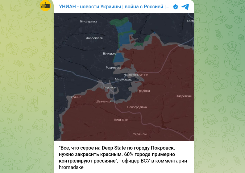 Высокопоставленный офицер с Покровского направления на условиях анонимности заявил, что россияне контролируют уже около 60% Покровска и активно проникают в соседние Родинское и Мирноград.
