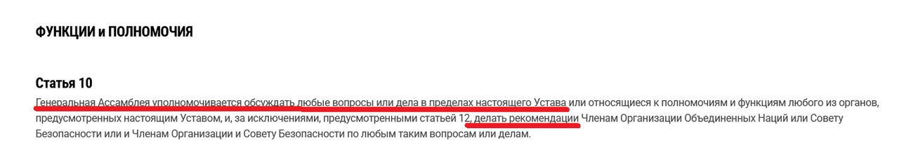 А можно ссылку на доказательства этого бреда?) А то есть Статья 14, и там говорится: «атья 14 С соблюдением положений статьи 12, Генеральная Ассамблея уполномочивается рекомендовать меры мирного улаживания любой ситуации, независимо от ее происхождения, которая, по мнению Ассамблеи, могла бы нарушить общее благополучие или дружественные отношения между нациями, включая ситуации, возникающие в результате нарушения положений настоящего Устава, излагающих Цели и Принципы Объединенных Наций.».