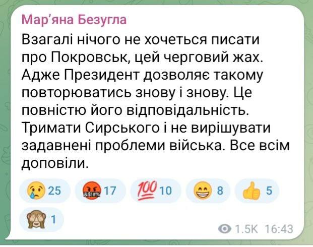 Перевод: Вообще ничего не хочется писать про Покровск, этот очередной ужас. Ведь Президент позволяет такому повторяться снова и снова. Это полностью его ответственность. Держать Сырского и не решать давние проблемы войска. Всё всем доложили.