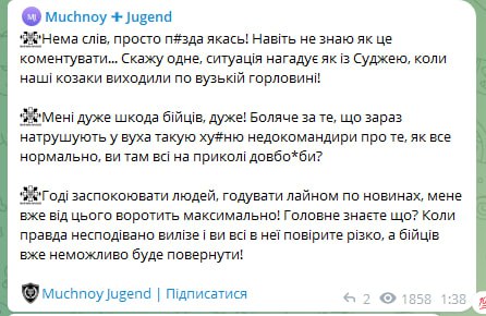 Перевод: Нет слов, просто п#### какая-то! Даже не знаю, как это комментировать… Скажу одно, ситуация напоминает Суджу, когда наши казаки выходили по узкой горловине! Мне очень жаль бойцов, очень! Больно за то, что сейчас льют в уши такую х#### недокомандиры о том, как все нормально, вы там все на приколе д#####бы? Хватит успокаивать людей, хватит кормить их дерьмом по новостям, меня уже от этого тошнит по максимуму!