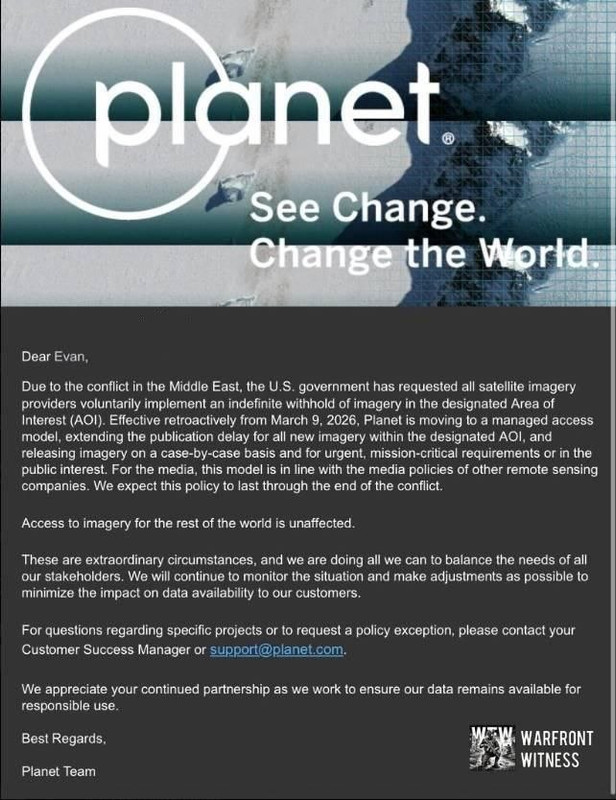 Компания Planet Labs сообщила исследователю газеты The Washington Post, что по запросу администрации Трампа больше не будет предоставлять спутниковые изображения районов, связанных с конфликтом вокруг Ирана .