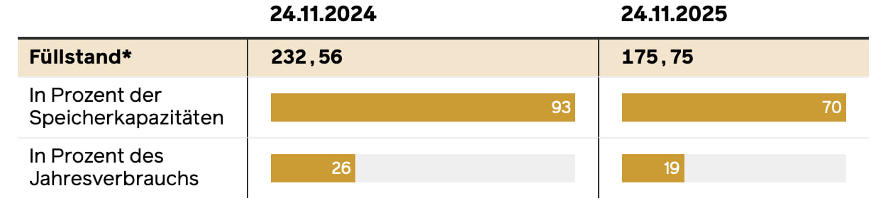 Согласно немецкому постановлению о заполнении газохранилищ (GasSpFüllstV), к 1 ноября должны были быть выполнены следующие целевые показатели: 80% для всех хранилищ (обычный случай) и 45% для хранилищ в Бад-Лаухштедте, Франкентале, Хенлейне, Реденe, Штокштадте и Ульзене. В совокупности это должно приводить к общему уровню заполнения около 70%. Эта цель на дату была выполнена — 75% — но, возможно, только потому, что целевой уровень был установлен довольно низко. Сейчас общий уровень снова снизился до 68,45%. Сильно ниже целевого значения оказался как раз газохранилище SEFE Storage в северогерманском Редене — всего 27,67% заполненности. Это крупнейшее газовое хранилище в Германии с мощностью около четырёх миллиардов кубометров. На него приходится примерно пятая часть всей национальной мощности хранения. В пласте на глубине 2000 метров и площади около восьми квадратных километров можно было бы хранить годовой объём потребления примерно двух миллионов частных домов. Сейчас используется только 21,14% общей мощности. До весны 2022 года хранилище управлялось компанией Astora, дочерней структурой тогдашней Gazprom Germania. В мае 2022 года нынешняя SEFE (Securing Energy for Europe) была передана под внешнее управление Федерального сетевого агентства решением тогдашнего министра экономики Роберта Хабека (Зелёные).