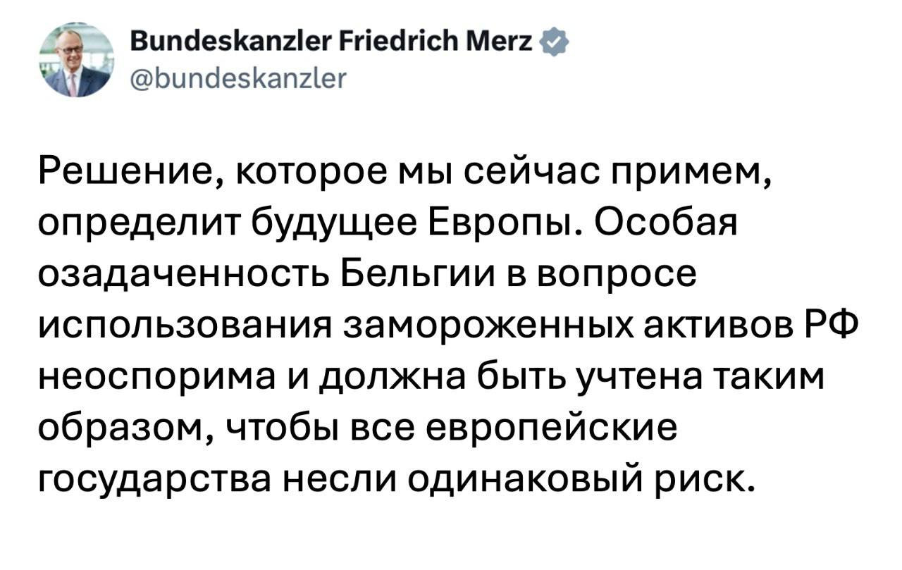 Канцлер Германии Фридрих Мерц (https://x.com/bundeskanzler/status/1997 054005801894381) и глава Еврокомиссии Урсула фон дер Ляйен (https://x.com/vonderleyen/status/199705 2772055974056)— о вчерашнем провальном ужине с бельгийским премьером де Вевером по вопросу использования замороженных активов РФ.