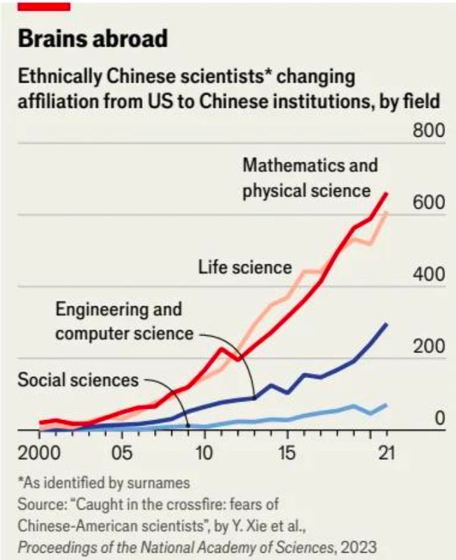 Китай получил значительную выгоду от этих процессов. Две трети китайских учёных, покидающих США в 2021 году, возвращались в Китай, тогда как в 2010 году их было меньше половины. Теперь причина этого становится всё очевиднее. Китайские расходы на науку и исследования выросли в 16 раз в реальном выражении с начала XXI века. А государство давно создало системы поддержки для возвращающихся специалистов. Там, где появляется один влиятельный учёный, за ним следуют другие. Ши Игон (биофизик) и Жао И (невролог), долгое время жившие в США, стали основателями нового исследовательского университета в Ханчжоу (провинция Чжэцзян), который уже привлёк более 200 учёных.