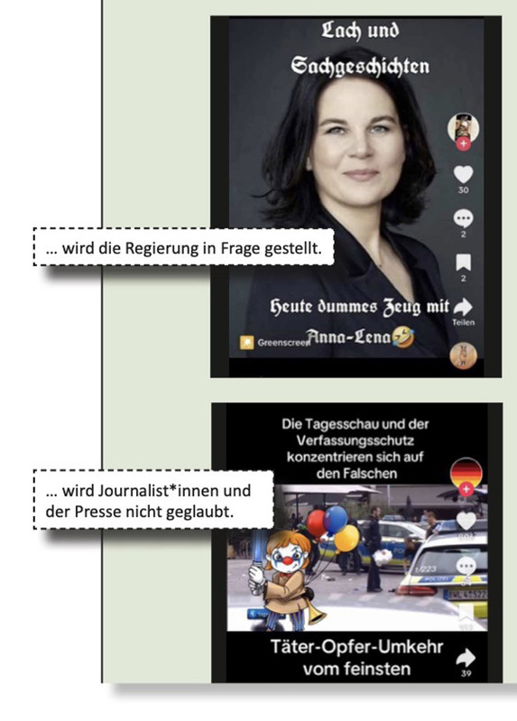 >>> По оценке «Klicksafe», это является правоэкстремистским кодом, поскольку здесь ставится под сомнение правительство. >>> То же самое относится к посту с изображением рейтингов партий и подписью: «Синий в тренде!!!». И в этом случае, по версии инициативы, «ставится под сомнение правительство». Дополнительно указывается, что «связь с АдГ либо интерес к АдГ, которая классифицируется Ведомством по охране конституции как подозреваемый в правоэкстремизме случай, во многих правых и правоэкстремистских профилях в социальных сетях видна открыто». >>> Также как правоэкстремистский определяется пост, в котором автор обвиняет программу Tagesschau в «переворачивании ролей жертвы и преступника». Вердикт «Klicksafe»: здесь «не доверяют журналистам и прессе».