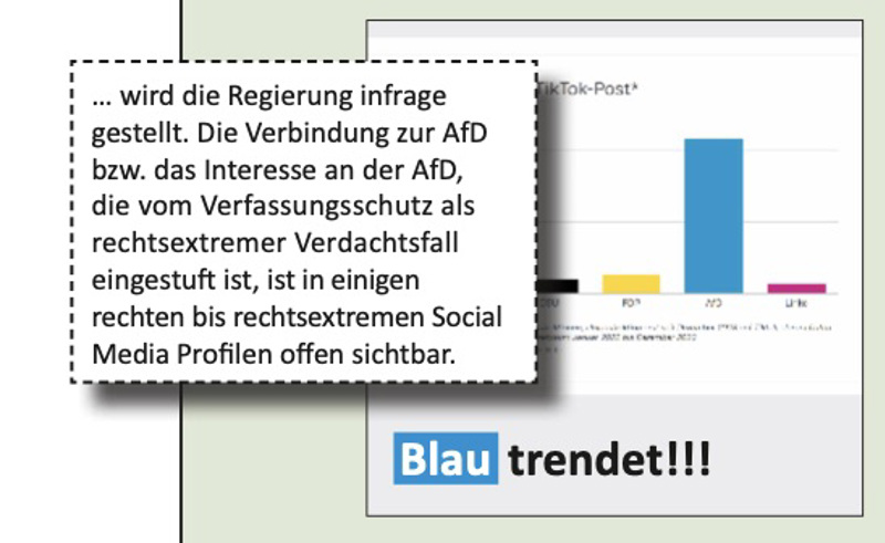 >>>>> По оценке «Klicksafe», это является правоэкстремистским кодом, поскольку здесь ставится под сомнение правительство. >>>>> То же самое относится к посту с изображением рейтингов партий и подписью: «Синий в тренде!!!». И в этом случае, по версии инициативы, «ставится под сомнение правительство». Дополнительно указывается, что «связь с АдГ либо интерес к АдГ, которая классифицируется Ведомством по охране конституции как подозреваемый в правоэкстремизме случай, во многих правых и правоэкстремистских профилях в социальных сетях видна открыто». >>>>> Также как правоэкстремистский определяется пост, в котором автор обвиняет программу Tagesschau в «переворачивании ролей жертвы и преступника». Вердикт «Klicksafe»: здесь «не доверяют журналистам и прессе». >>>