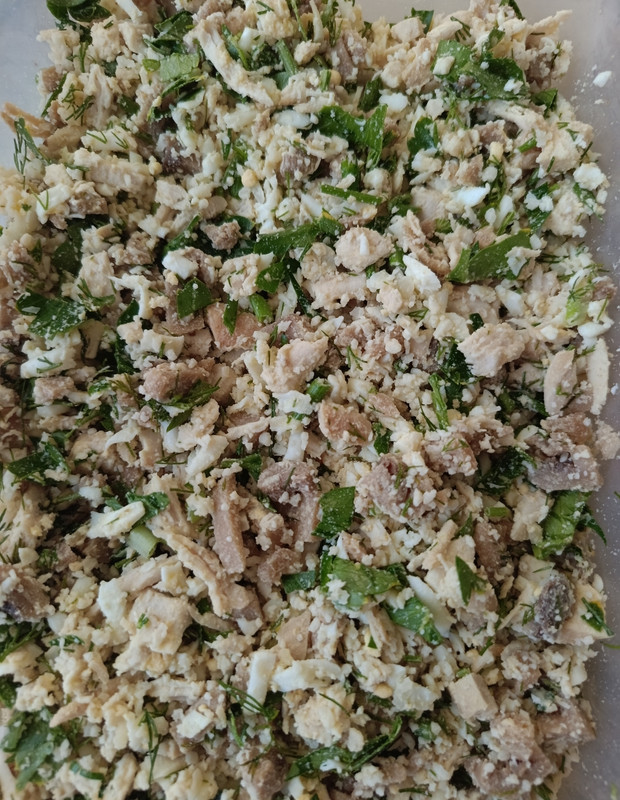 > 1 петрушка 2 у к р о п 3 натертый полутвердый сыр 4. Язык? 5, Грецкие орехи? 6 яйца > Я вот путаюсь пока по языку/мяску или грибам пока что > Язык вроде потемнее, хм хм