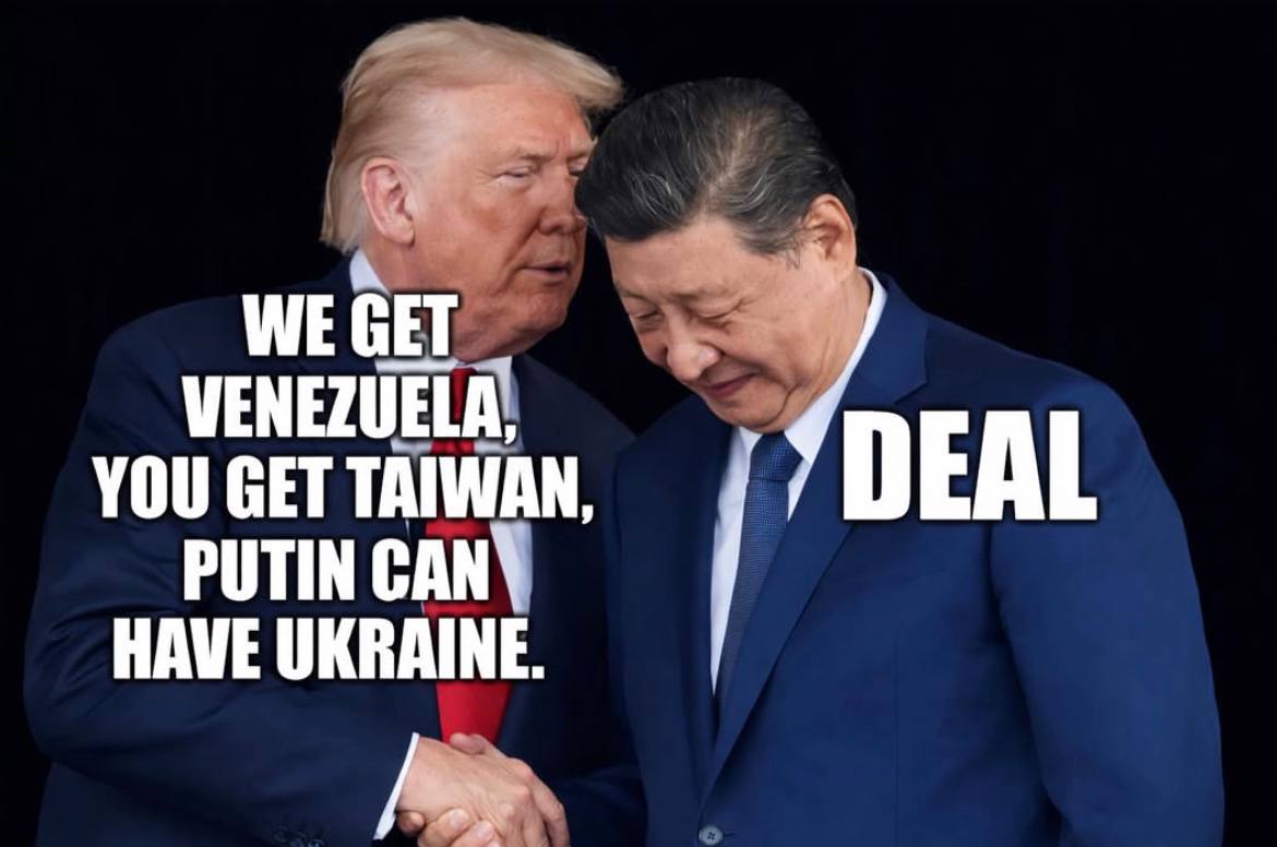 В обращении Си как раз было то, хоть и традиционно, что Китай и Тайвань - единый народ и что возвращение неизбежно. Приготовления Китая в общем-то к тому и ведут, что просто так оставить прецедент с Мадуро они не смогут, будет реакция и скорее всего в этом году или следующем Будут это делать уже при Донни, с которым понятно, как он отскакивает и чего он боится Он очень боится влезть в войны надолго, потому когда если не сейчас. Тем более, если у латиносов подогреть градус против США