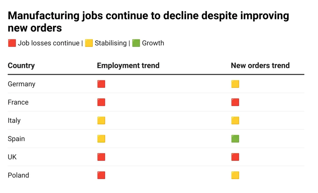 > > Ему и не откуда быть сейчас в плюсе, учитывая всю ситуацию, по Германии прогноз на след год самый оптимистичный, что может подрастет немного, но это не точно > Вот ща сек > The HCOB Germany Manufacturing PMI fell to 48.4 in November 2025 from 49.6 in October, below the expected improvement to 49.8, marking the sharpest contraction in six months, according to preliminary estimates. Output expanded at its slowest pace since July, while new orders fell for the second time in three months, driven largely by a sharper decline in export sales. Backlogs of work in manufacturing also declined further, reflecting reduced capacity pressures. Employment in the sector continued to fall, with staffing levels decreasing slightly faster than in October. > >
