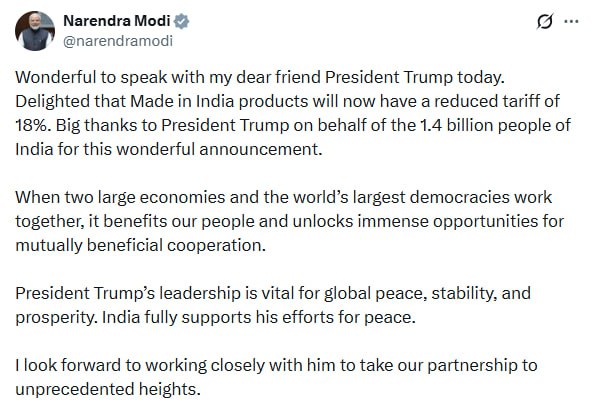Индийский премьер в своем посте о разговоре с Трампом вообще не вспомнил о российской нефти, которую, по словам Трампа , Индия теперь покупать не будет.