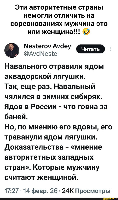 >>>>> Само по себе и из серии последней соломинки >>>> >>>> Да вот если бы даже, куда выгоднее было бы, чисто с циничной точки зрения, Кремлю Навального убрать демонстративно. И показать, типа и ничего вы не сделаете, все. Без всяких ядов лягушек и прочих чесаний правой рукой левого уха >>>> Устрашать можно было бы и показывать свою безнаказанность, если уж начали гнать КГБ-ФСБ, совсем иначе. >>> >>> >>>> >>>> Навальный слишком мало ролял, чтобы вокруг него пляски устраивать с лягушками.