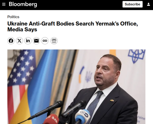 Ермак является ближайшим пособником Зеленского и возглавляет администрацию президента с 2020 года. На прошлой неделе Зеленский отклонил требование законодателей от своей партии уволить Ермака в рамках последнего скандала о взяточничестве, в котором замешан другой союзник президента.