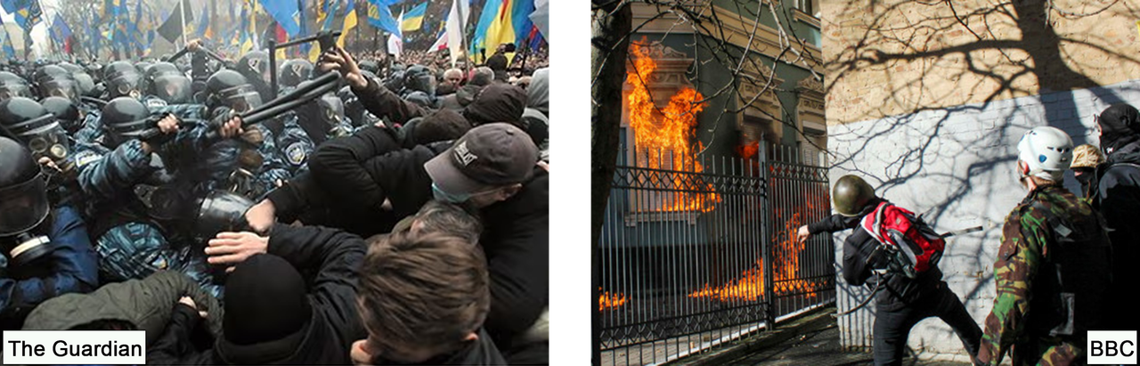 В дальнейшем агрессивность протестующих возросла и на последнем этапе Евромайдана они уже стали убивать; см. вверху справа поджога офиса правящей партии, при котором в огне погиб программист офиса.