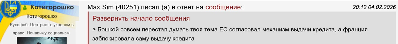 >>> >>>>>> Вот это ты показал как вас дибилят >>>>> 04 февраля 2026 года. Франция заблокировала помощь Украине: Кредит ЕС на € 90 млрд завис из-за требований Парижа, — Politico Вас точно «не» дебилят