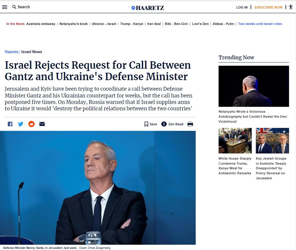Haaretz: Израиль отклонил просьбу Украины о телефонной беседе министров обороны двух стран Oct 18, 2022
