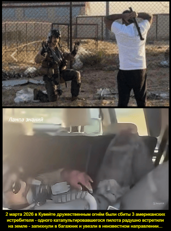 > Сегодня дружественным огнём в дружественном американцам Кувейте было сбито три американских истребителя (ну это как 3 уничтоженных американских солдата после тысяч выпущенных ракет) так что умножайте - не ошибётесь. Одного катапультировашегося пилота на земле ждал радушный приём и эвакуация в багажнике легкового авто в неизвестном направлении.. > > > > Может мы что то не знаем об истинной ситуации на земле? и черпаем инфу из лживых СМИ? сейчас фотографии американского пилота пережившего травму катапультирования с поднятыми руками удаляют отовсюду - приходится вырезать из видео! >