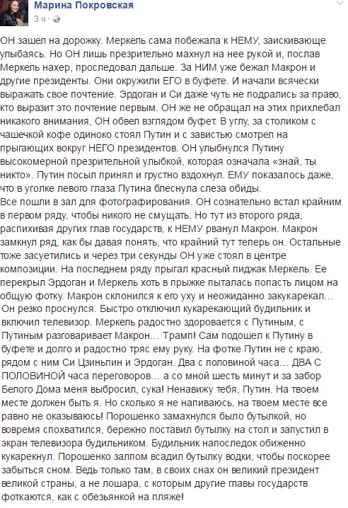 — Владимир Владимирович, — сказал он. — Простите, что отвлекаю Вас от повседневных захватнических планов, но должен напомнить, что седьмого июля состоится саммит G-20 в Гамбурге.